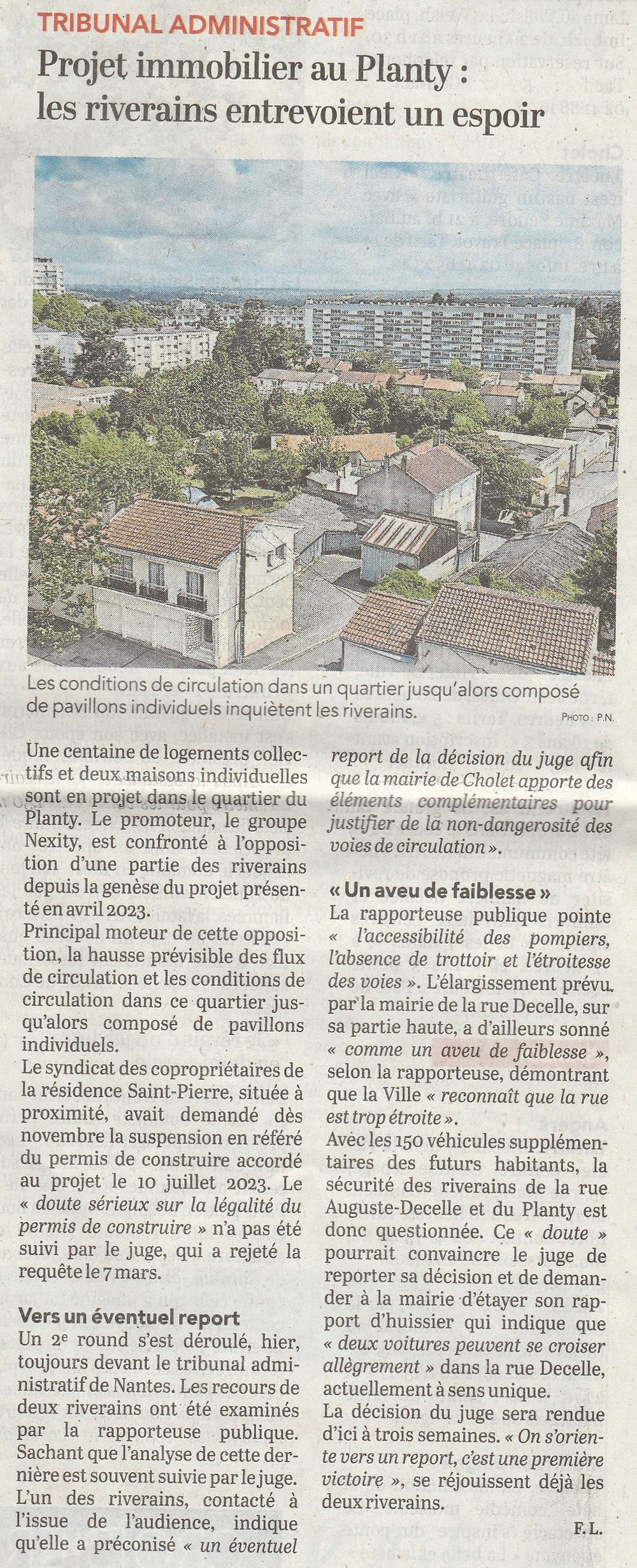 Estimant la décision du tribunal injuste et après des rencontres individuelles et informelles avec le Directeur régionale de Nexity et le premier adjoint de la mairie de Cholet, un habitant de la rue du Planty juge que les projets proposés ne répondent toujours pas aux problématiques de sécurité des riverains.